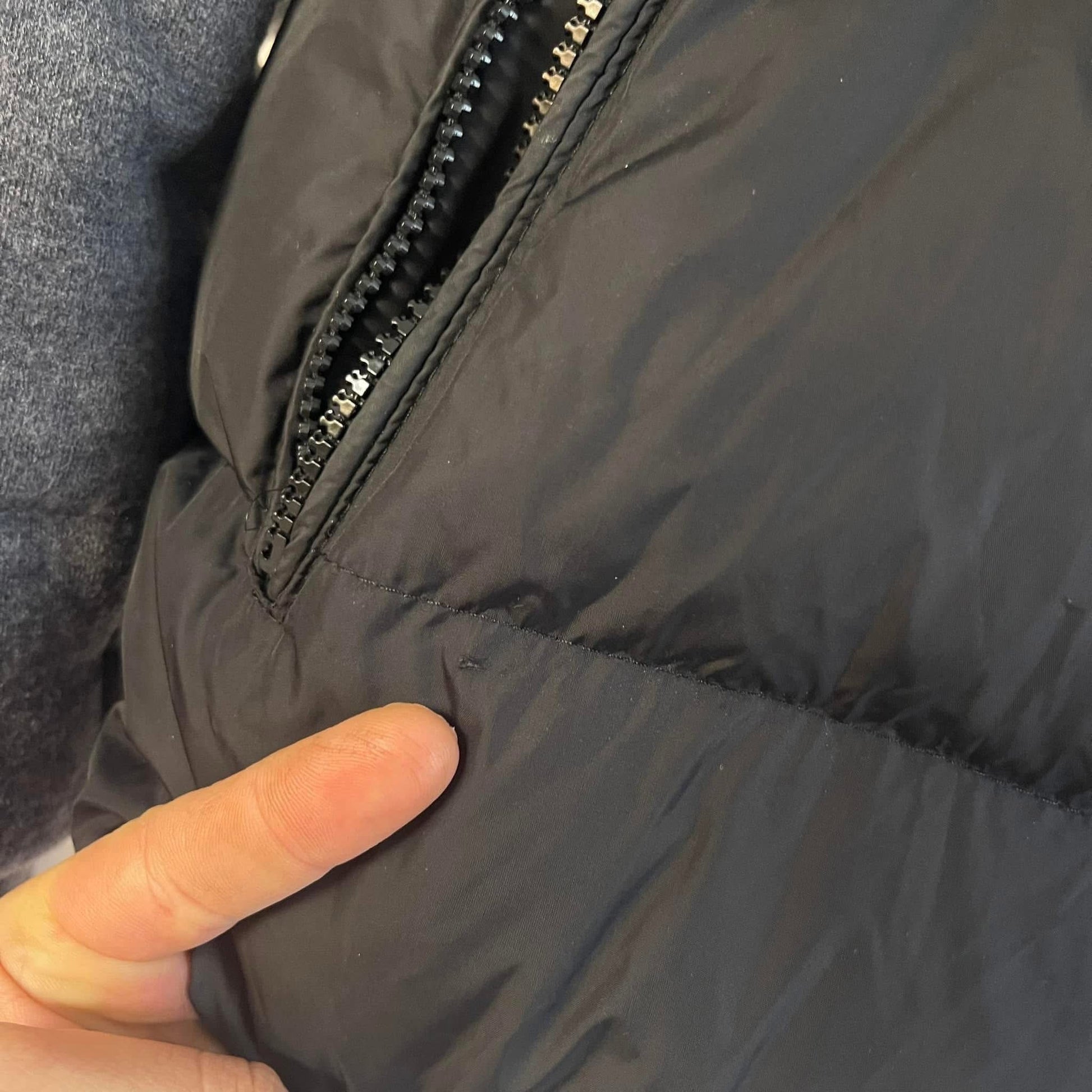 - Good used condition, missing right pocket zip & tiny pinhole next to pocket.